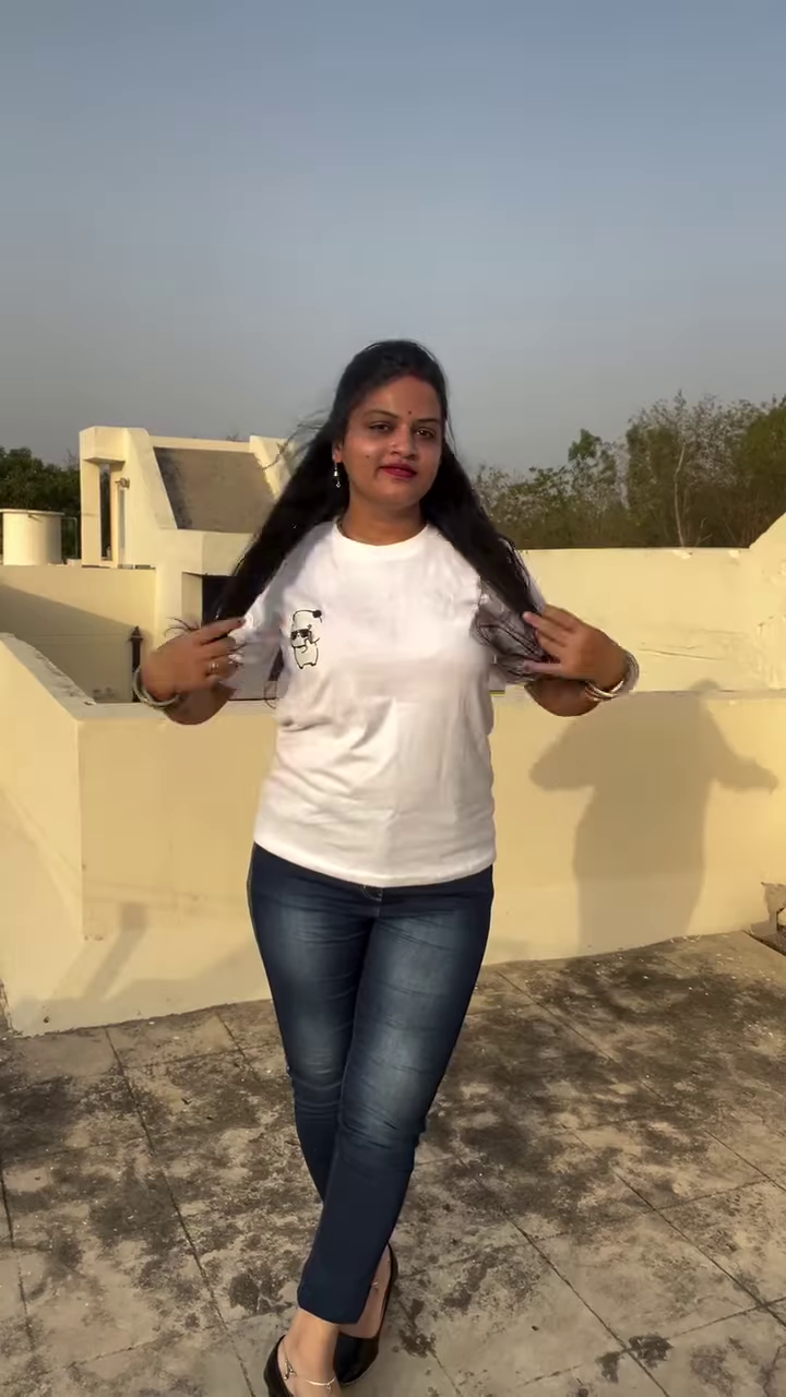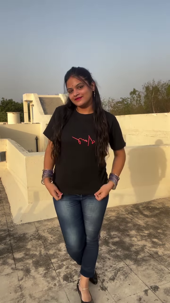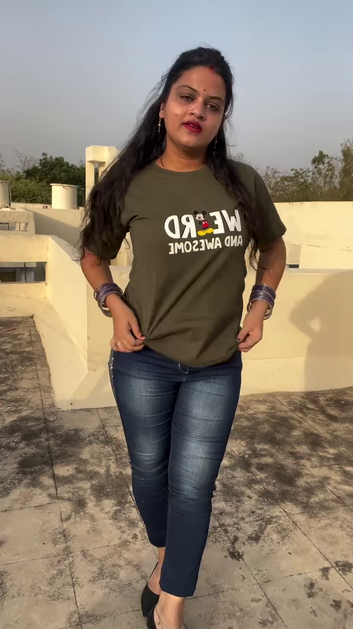 This ensemble is designed for comfort and style. The T-shirt is likely made from a soft, breathable cotton blend, making it ideal for warmer weather or active days. The jeans are durable and provide a secure fit. The outfit is accessorized with a few key pieces that tie the look together. The model is wearing a stack of silver or dark-colored bangles on each wrist, which add a traditional and decorative element. She is also wearing dark-colored footwear, possibly flats or low heels, that complete the casual yet polished look. This outfit is incredibly versatile; you can dress it up with a pair of heels and a blazer for a casual dinner or keep it simple with sneakers for running errands. Its ability to adapt to different settings makes it an essential part of a modern wardrobe.