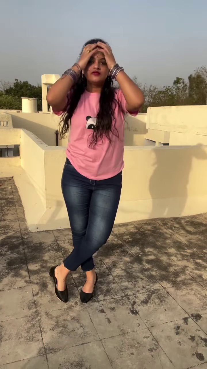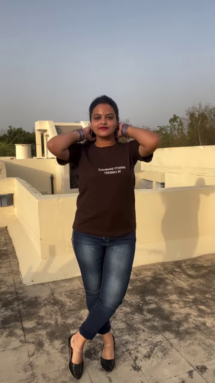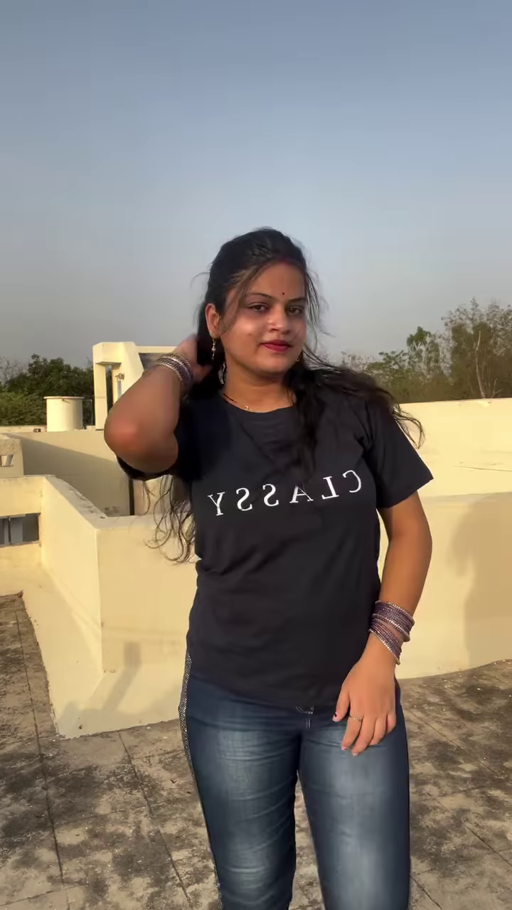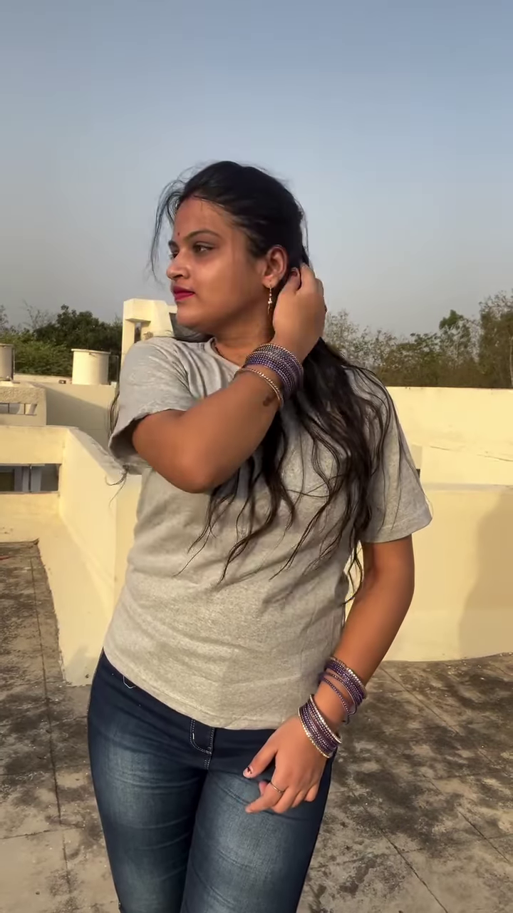 This ensemble is designed for comfort and style. The T-shirt is likely made from a soft, breathable cotton blend, making it ideal for warmer weather or active days. The jeans are durable and provide a secure fit. The outfit is accessorized with a few key pieces that tie the look together. The model is wearing a stack of silver or dark-colored bangles on each wrist, which add a traditional and decorative element. She is also wearing dark-colored footwear, possibly flats or low heels, that complete the casual yet polished look. This outfit is incredibly versatile; you can dress it up with a pair of heels and a blazer for a casual dinner or keep it simple with sneakers for running errands. Its ability to adapt to different settings makes it an essential part of a modern wardrobe.