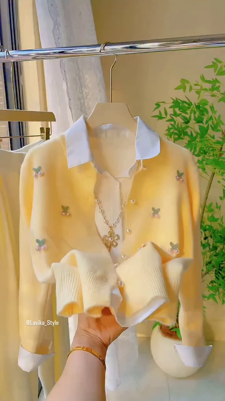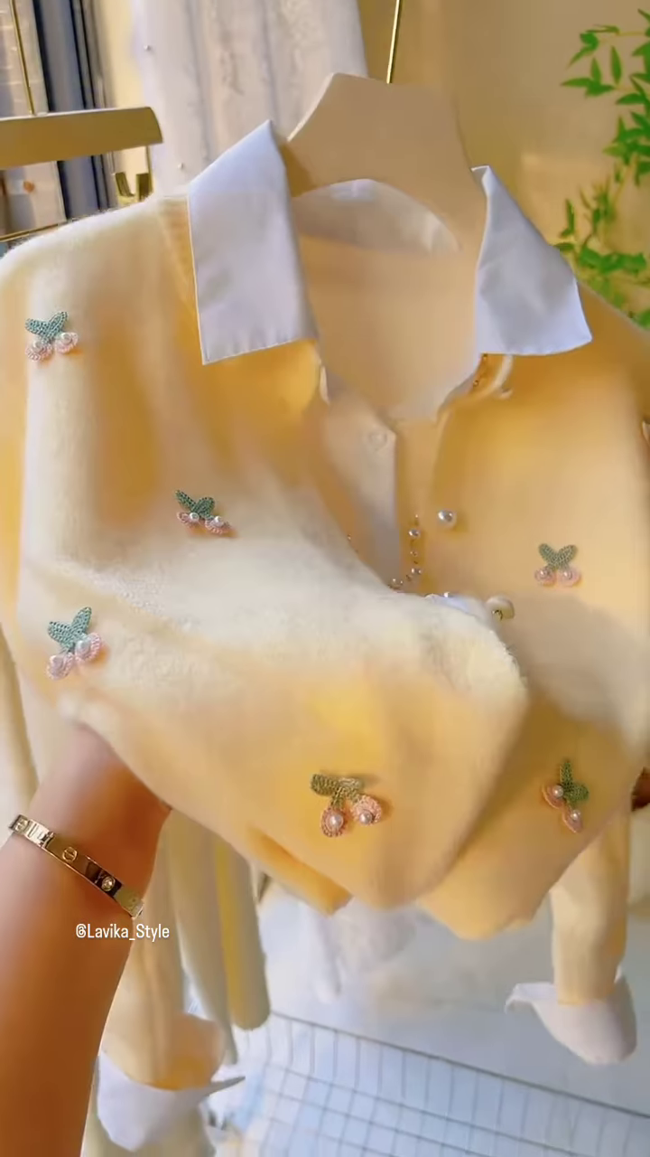 The set features a beautifully crafted knit cardigan and a coordinating inner top. The cardigan is the main attraction, made from a plush, soft-knit fabric in a lovely pastel shade of light yellow or lemon sorbet. The texture appears to be a fine, luxurious knit that is both comfortable and stylish. The cardigan has a classic silhouette with a button-down front, but it is elevated by its charming design details. It is adorned with delicate, three-dimensional embroidered motifs, possibly depicting tiny cherries or floral clusters. These small embellishments are done in subtle, complementary colors like soft pink and a pale, shimmery green. Each motif is often finished with a tiny pearl or bead at its center, adding a touch of a sophisticated sparkle that catches the light beautifully. The thoughtful placement of these embroidered accents across the cardigan creates a playful yet elegant pattern.