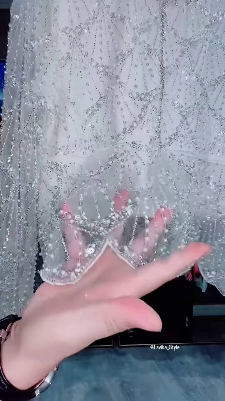 The most captivating feature of this top is the heavy, meticulous sequin and bead work. The entire surface is covered in a dense, shimmering pattern that resembles a celestial or fan-like motif. The beads and sequins are a brilliant silver or clear iridescent color, which catches and reflects light from every angle, creating a dazzling effect. The design is a series of beautiful, repeating fan shapes that radiate from the neckline and flow down the body. Each fan shape is meticulously outlined with tiny beads, and the inner part is filled with sparkling sequins, creating a rich tapestry of texture and shine. The craftsmanship is truly exceptional, with each embellishment carefully placed to create a cohesive and graceful design. The long sleeves also feature the same intricate patterns, ensuring the beauty of the top is visible from every angle.