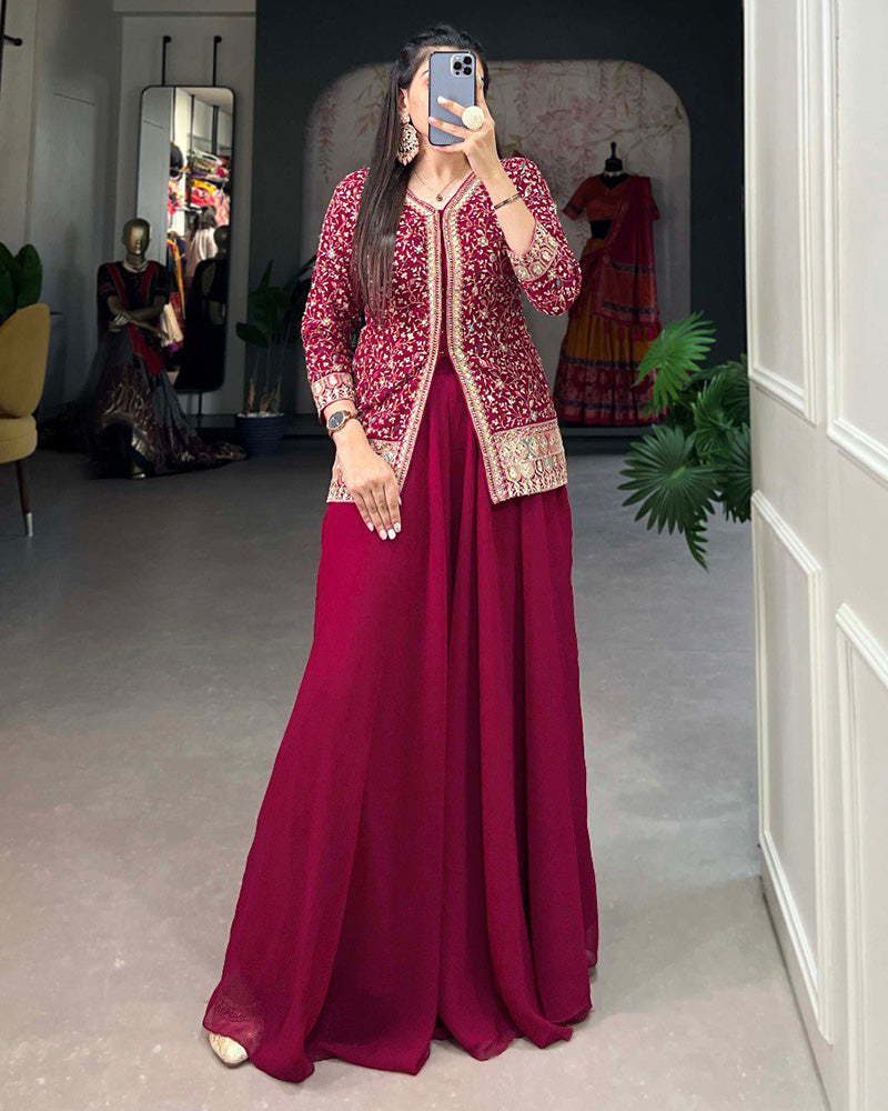 Rani Pink Color Embroidery Work Georgette Plazo Suit